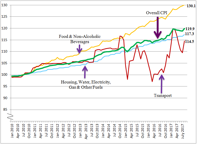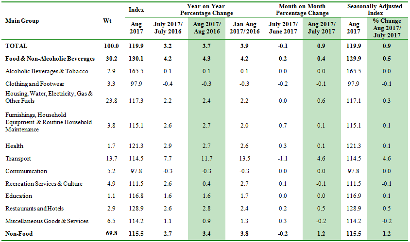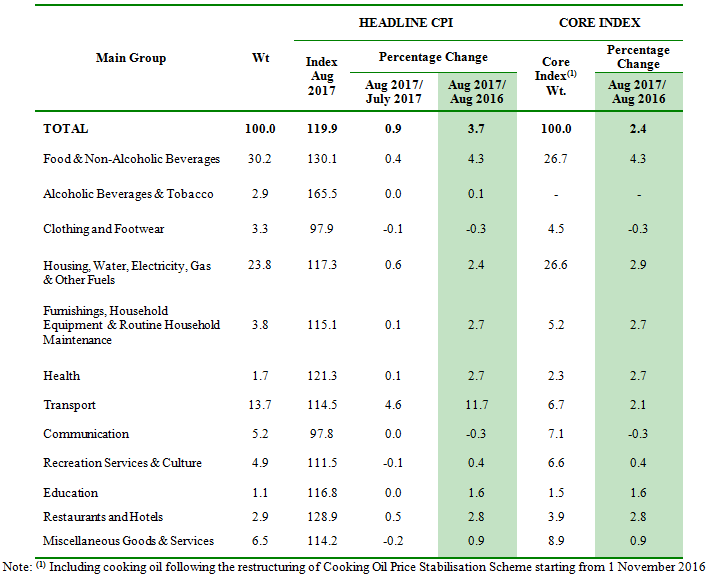 The overall index for CPI rose at a higher rate of 3.7 per cent to 119.9 in August 2017 from 115.6 in the corresponding month of the preceding year. Among the major groups which recorded increases were the indices for Transport (+11.7 per cent), Food & Non-Alcoholic Beverages (+4.3 per cent), Restaurants and Hotels (+2.8 per cent), Health (+2.7 per cent), Furnishings, Household Equipment & Routine Household Maintenance (+2.7 per cent) and Housing, Water, Electricity, Gas & Other Fuels (+2.4 per cent). (Table 1)