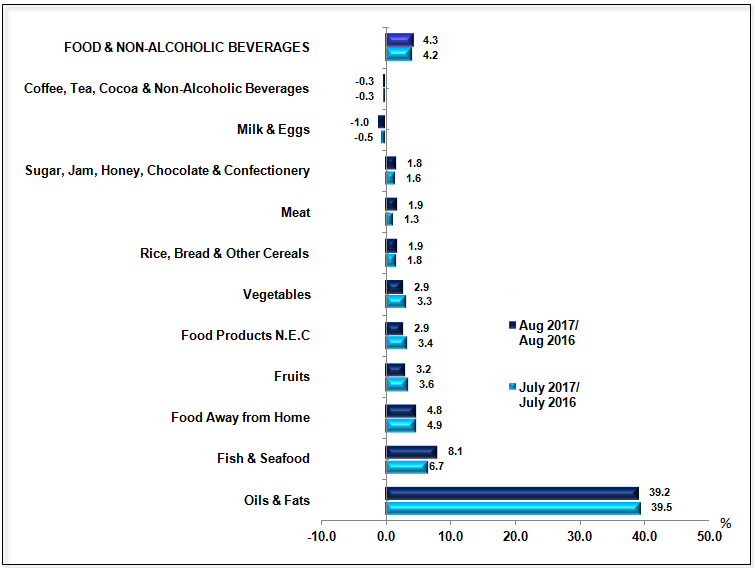 CPI for the period January to August 2017 registered an increase of 3.9 per cent compared with the same period last year. The index for Food & Non-Alcoholic Beverages was the main contributor to the rise in CPI for the period January to August 2017, registered an increase of 4.2 per cent. The increase was contributed by the index for Food Away From Home (+4.6 per cent) and Food At Home (+4.3 per cent). While, the index for Coffee, Tea, Cocoa & Non-Alcoholic Beverages decreased 0.4 per cent. Among the subgroups of Food At Home which showed significant increases during this period as shown in Table 2 were Oils & Fats (+38.9 per cent), Fish & Seafood (+6.5 per cent), Vegetables (+4.1 per cent), Meat (+3.3 per cent) and Fruits (+3.2 per cent).