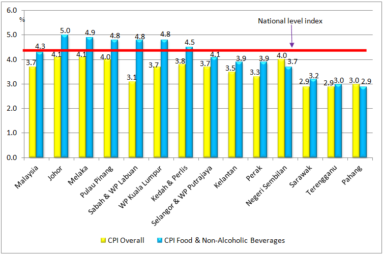 The increase in the index for Food & Non-Alcoholic Beverages was reflected in most states in Malaysia especially those in highly urbanised states such as Wilayah Persekutuan Kuala Lumpur, Selangor & Wilayah Persekutuan Putrajaya, Pulau Pinang, Johor and Melaka.