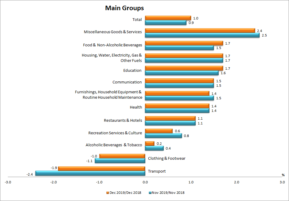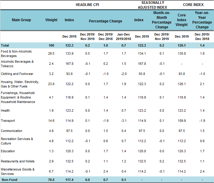 Core index rose 1.4 per cent in December 2019 as compared to the same month of the previous year. Among the major groups which influenced the increases were Miscellaneous Goods & Services (2.4%), Housing, Water, Electricity, Gas & Other Fuels (2.1%), Food & Non-Alcoholic Beverages (1.8%), Education (1.7%), Communication (1.5%), Furnishings, Household Equipment & Routine Household Maintenance (1.4%) and Health (1.4%).