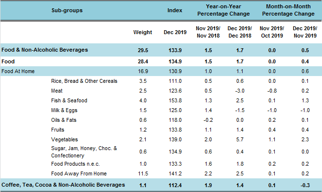 The index for Food & Non-Alcoholic Beverages increased 1.7 per cent in December 2019 as compared to the same month of the previous year. The increase was attributed by the food sub-group of Vegetables (5.7%), Fish & Seafood (2.5%), Food Products not elsewhere classified (1.8%) and Fruits (1.4%).