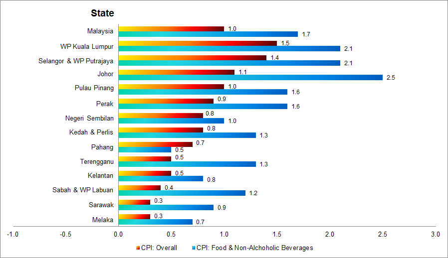 Three states namely Wilayah Persekutuan Kuala Lumpur (1.5%), Selangor & Wilayah Persekutuan Putrajaya (1.4%) and Johor (1.1%) surpassed the national CPI rate of 1.0 per cent in December 2019 as compared to the same month in the preceding year.