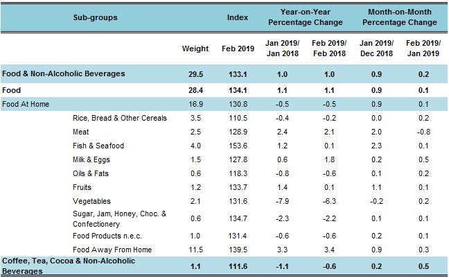 The overall index for Food & Non-Alcoholic Beverages increased 1.0 per cent in February 2019. This was attributed by the food sub-group index of Meat (+2.1 per cent), Milk & Eggs (+1.8 per cent), Fish & Seafood (+0.1 per cent) and Fruits (+0.1 per cent). Conversely, the index for sub-group Vegetables decreased 6.3 per cent, followed by Sugar, Jam, Honey, Chocolate & Confectionery (-2.2 per cent) and Oils & Fats (-0.6 per cent).