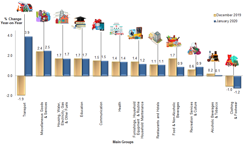 On a monthly basis, CPI rose 0.1 per cent as compared to December 2019. The increase was mainly supported by the index of Education (0.4%), Miscellaneous Goods & Services (0.4%), Health (0.2%) and Recreation Services & Culture (0.2%).