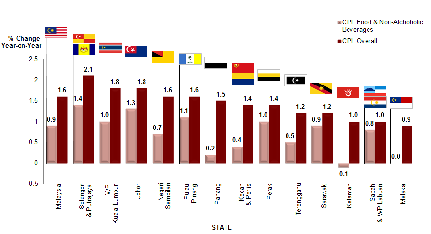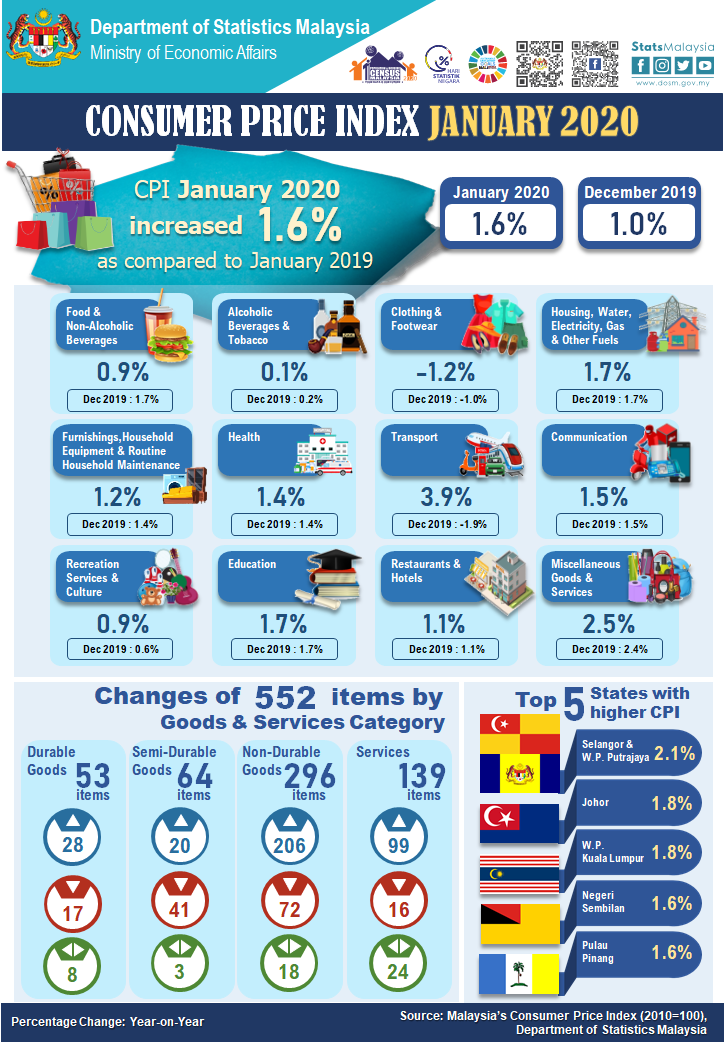 Three states namely Selangor & Wilayah Persekutuan Putrajaya (2.1%), Wilayah Persekutuan Kuala Lumpur (1.8%) and Johor (1.8%) surpassed the national CPI rate of 1.6 per cent in January 2020 as compared to the same month in the preceding year.