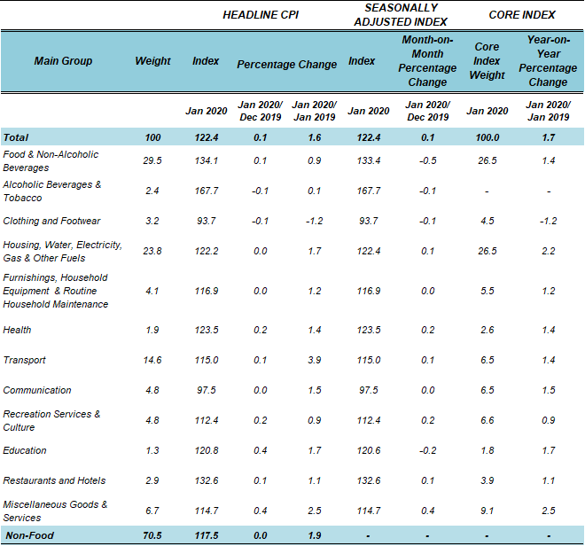 Core index rose 1.7 per cent in January 2020 as compared to the same month of the previous year. Among the major groups which influenced the increase were Miscellaneous Goods & Services (2.5%), Housing, Water, Electricity, Gas & Other Fuels (2.2%), Education (1.7%), Communication (1.5%), Food & Non-Alcoholic Beverages (1.4%),Transport (1.4%) and Health (1.4%).