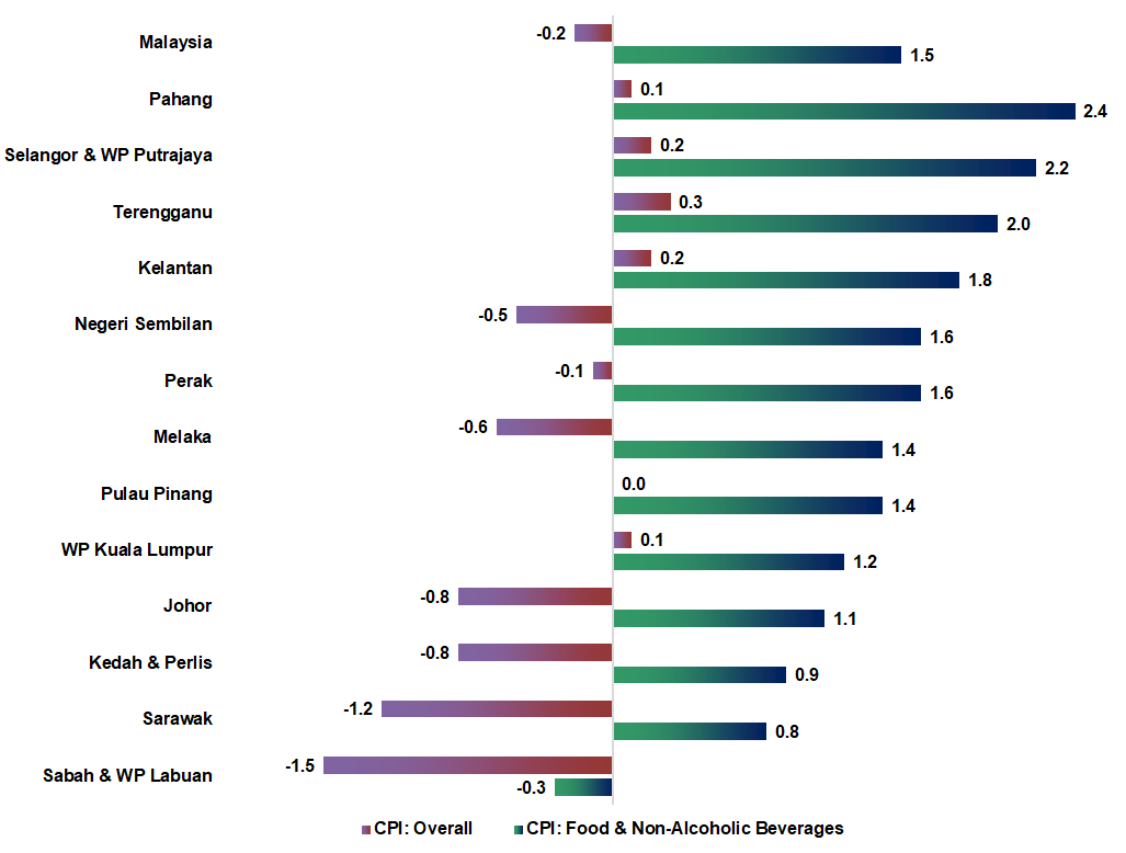 Five states namely Terengganu (0.3%), Selangor & Wilayah Persekutuan Putrajaya (0.2%), Kelantan (0.2%), Wilayah Persekutuan Kuala Lumpur (0.1%) and Pahang (0.1%) surpassed the national CPI rate of -0.2 per cent in January 2021 as compared to January 2020.