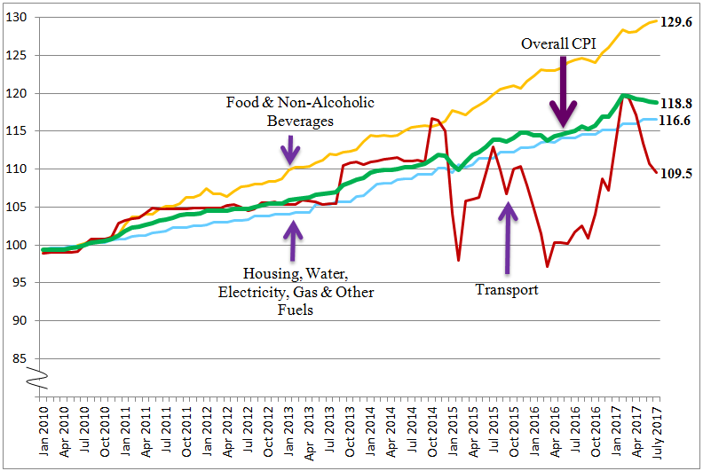 The Consumer Price Index rose by 3.2 per cent on a year-on-year basis in July 2017, 0.4 point lower compared to 3.6 per cent in June 2017. Among the major groups which recorded increases were the indices for Transport (+7.7 per cent), Food & Non-Alcoholic Beverages (+4.2 per cent), Health (+2.9 per cent), Recreation Services & Culture (+2.6 per cent), Restaurants and Hotels (+2.6 per cent) and Furnishings, Household Equipment & Routine Household Maintenance (+2.6 per cent). (Table 1)