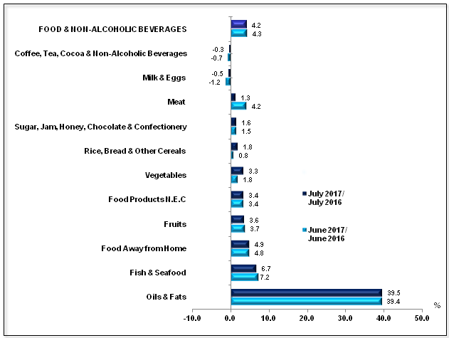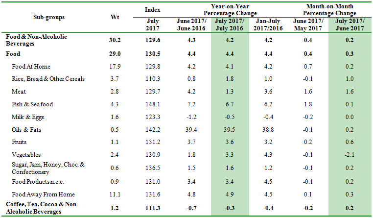 CPI for the period January to July 2017 registered an increase of 4.0 per cent compared with the same period last year. The index for Food & Non-Alcoholic Beverages was the main contributor to the CPI rise in the period January to July 2017, registered an increase of 4.2 per cent. The increase was the result of increases in the index for Food Away From Home (+4.5 per cent) and Food At Home (+4.2 per cent). While, the index for Coffee, Tea, Cocoa & Non-Alcoholic Beverages decreased 0.4 per cent. Among the subgroups of Food At Home which showed significant increases during this period as shown in Table 2 were Oils & Fats (+38.8 per cent), Fish & Seafood (+6.2 per cent), Vegetables (+4.3 per cent), Meat (+3.6 per cent) and Fruits (+3.2 per cent).