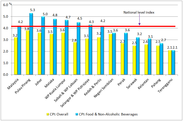 The increase in the index for Food & Non-Alcoholic Beverages was reflected in most states in Malaysia especially those in highly urbanised states such as Wilayah Persekutuan Kuala Lumpur, Selangor & Wilayah Persekutuan Putrajaya, Pulau Pinang, Johor and Melaka.