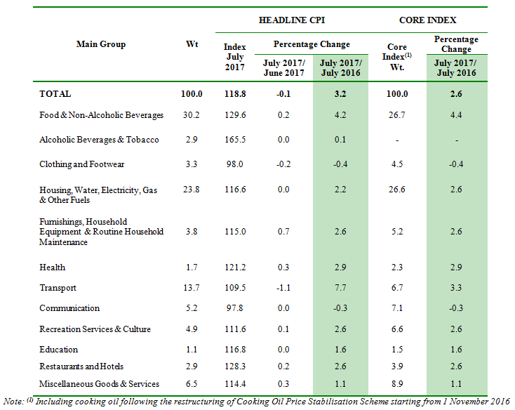 Core inflation rose 2.6 per cent in July 2017 compared with the same month of the previous year. Among the major groups which influenced the higher core rate were price increases of Food & Non-Alcoholic Beverages (+4.4 per cent), Transport (+3.3 per cent), Health (+2.9 per cent), Recreation Services & Culture (+2.6 per cent), Housing, Water, Electricity, Gas & Other Fuels (+2.6 per cent) and Furnishings, Household Equipment & Routine Household Maintenance (+2.6 per cent). (Table 3)