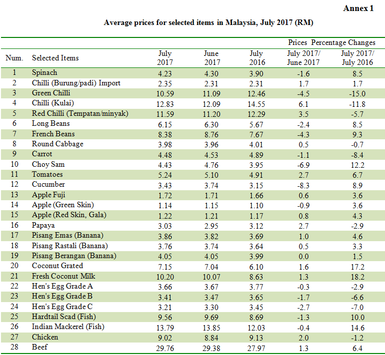 Among the index of food items which recorded notable increases in July 2017 compared to the same period last year were Cooking Oil (+48.9 per cent), Spinach (+11.4 per cent), Tomatoes (+10.4 per cent), Indian Mackerel (Fish) (+10.1 per cent), Choy Sam (+8.8 per cent), Hardtail Scad (Fish) (+7.5 per cent), Prawn (+6.2 per cent), Spanish Mackerel (Fish) (+5.5 per cent) and Cuttlefish (+3.6 per cent). Meanwhile, decreases were registered in the index of some food items such as Carrots (-7.9 per cent), Hen's Eggs (-4.9 per cent) and Onions, Big (-2.2 per cent).