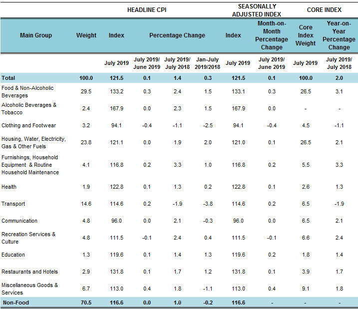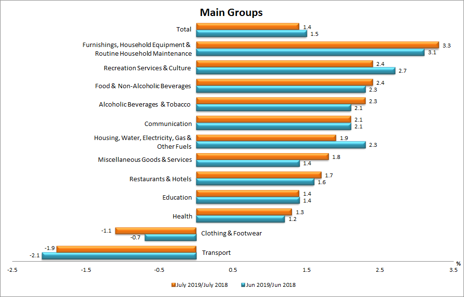 Core index increased 2.0 per cent in July 2019 as compared to the same month of the previous year. Among the major groups which influenced the higher core rate were price increases of Furnishings, Household Equipment & Routine Household Maintenance (3.3%), Food & Non-Alcoholic Beverages (3.1%), Recreation Services & Culture (2.4%) and Communication (2.1%).