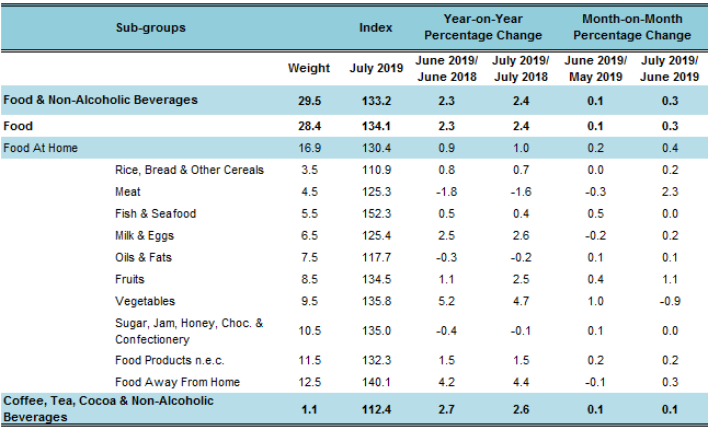 The index for Food & Non-Alcoholic Beverages increased 2.4 per cent in July 2019 as compared to the same month of the previous year. The increase was attributed by the food sub-group index of Vegetables (4.7%), Milk & Eggs (2.6%) and Fruits (2.5%).