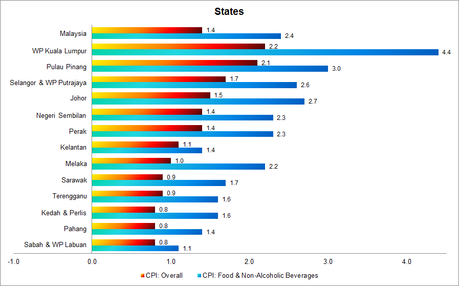 Four states namely Wilayah Persekutuan Kuala Lumpur (2.2%), Pulau Pinang (2.1%), Selangor & Wilayah Persekutuan Putrajaya (1.7%) and Johor (1.5%) surpassed the national CPI rate of 1.4 per cent in July 2019 as compared to July 2018. Meanwhile, Negeri Sembilan and Perak showed the same rate of increase as the national CPI.