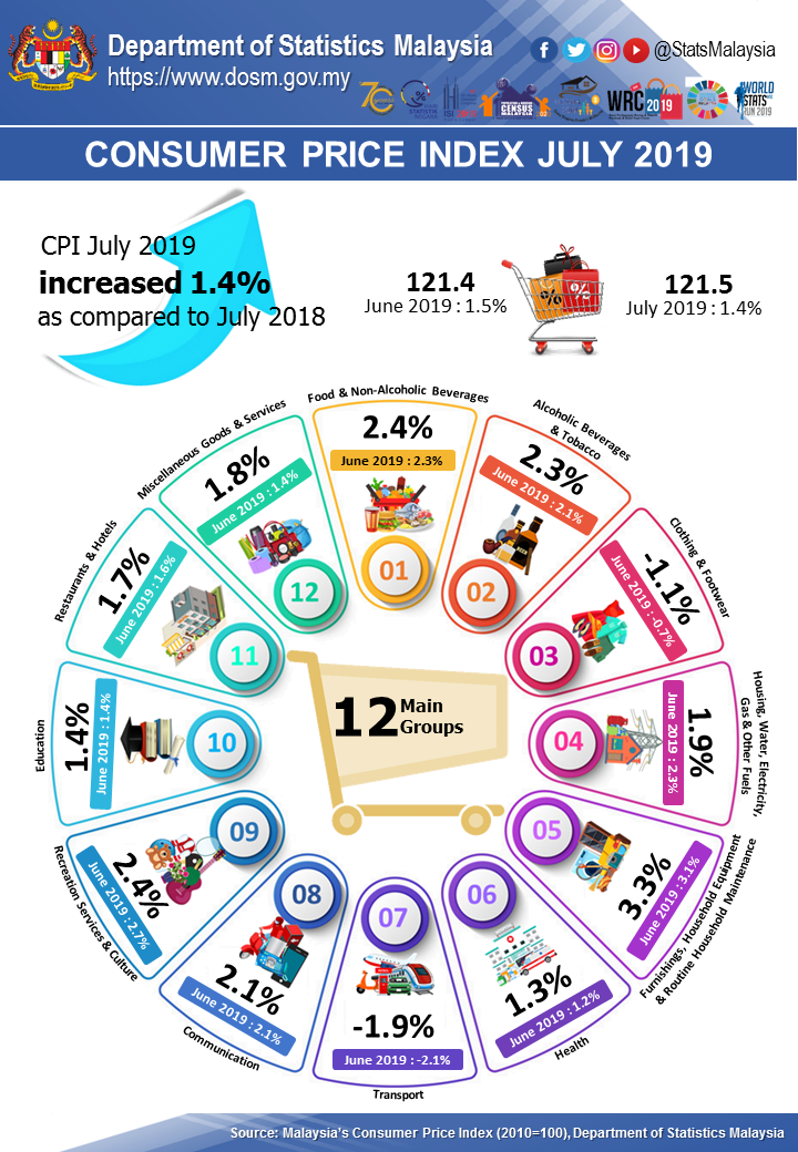 On a monthly basis, CPI rose 0.1 per cent as compared to June 2019. It was mainly supported by the index of Food & Non-Alcoholic Beverages (0.3%), Furnishings, Household Equipment & Routine Household Maintenance (0.2%) and Transport (0.2%). Meanwhile, CPI for the period of January – July 2019 registered an increase of 0.3 per cent as compared to the same period last year.
