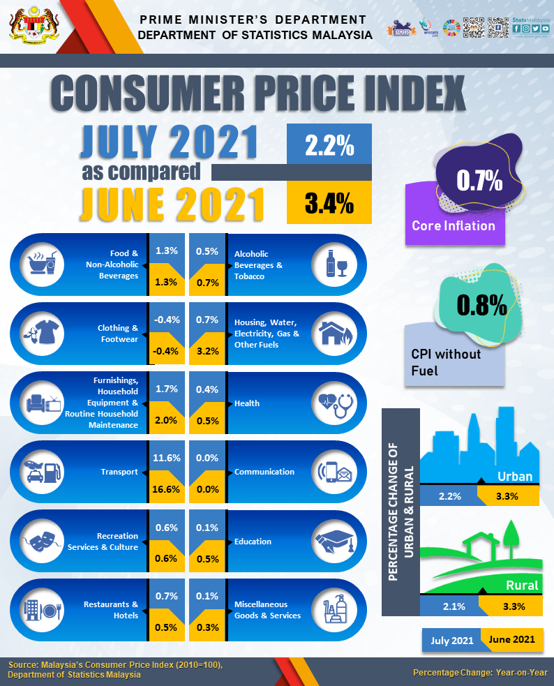 The full publication of the Consumer Price Index Malaysia, July 2021 can be downloaded from eStatistik portal.