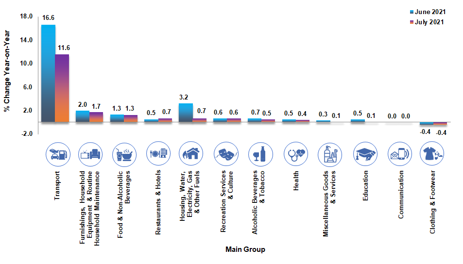Core index rose 0.7 per cent in July 2021 as compared to the same month of the previous year. Among the major groups which influenced the increase were Furnishings, Household Equipment & Routine Household Maintenance (1.7%); Food & Non-Alcoholic Beverages (1.1%); Transport (1.0%); Restaurants & Hotels (0.7%); Housing, Water, Electricity, Gas & Other Fuels (0.6%); Recreation Services & Culture (0.6%); Health (0.4%); Education (0.1%) and Miscellaneous Goods & Services (0.1%).