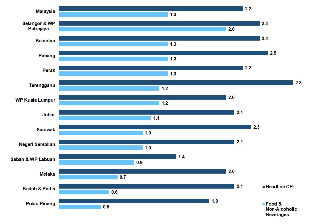Five states namely Terengganu (2.8%), Pahang (2.5%), Selangor & Wilayah Persekutuan Putrajaya (2.4%), Kelantan (2.4%) and Sarawak (2.3%) surpassed the national CPI rate of 2.2 per cent in July 2021 as compared to the same month of the previous year.
