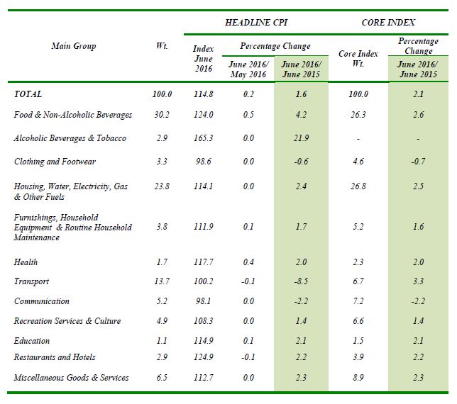 The Consumer Price Index (CPI) for June 2016 increased by 1.6 per cent to 114.8 compared with 113.0 in the same month last year. Among the major groups which recorded increases were the index for Alcoholic Beverages & Tobacco by 21.9 per cent; Food & Non-Alcoholic Beverages (+4.2 per cent); Housing, Water, Electricity, Gas & Other Fuels (+2.4 per cent); Miscellaneous Goods & Services (+2.3 per cent); Restaurants & Hotels (+2.2 per cent) and Education (+2.1 per cent). In addition, the overall index is also influenced by the decrease in prices of Transport group by 8.5 per cent; Communication (-2.2 per cent) and Clothing & Footwear (-0.6 per cent).