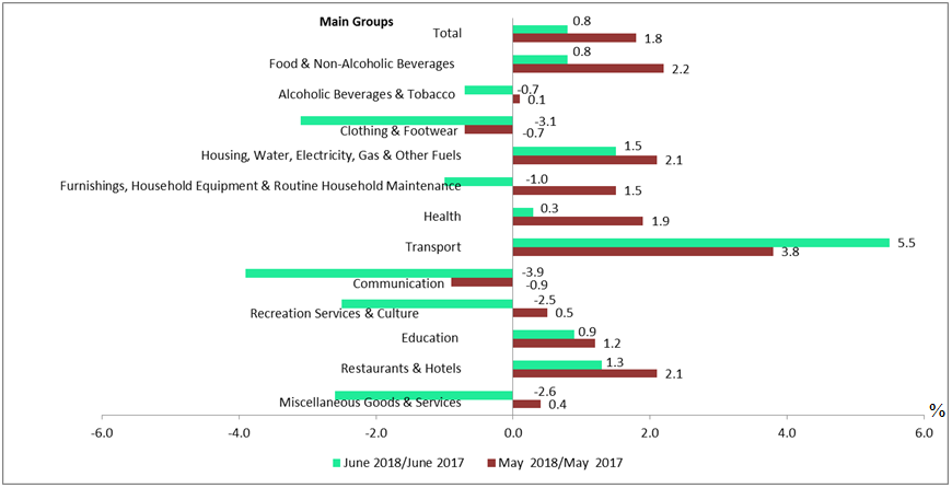 Chart 1: Consumer Price Index (2010=100): Percentage Change by Main Groups, Malaysia, June 2018/June 2017