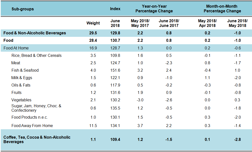 Table 1: Consumer Price Index (2010=100): Annual Percentage Change by Sub-Groups Food & Non-Alcoholic Beverages, Malaysia, June 2018/June 2017