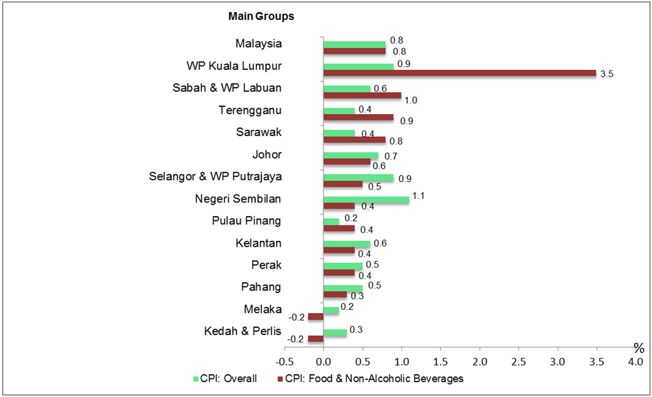 In terms of overall CPI, three states surpassed the national CPI rate of 0.8 per cent recorded in June 2018 as compared to June 2017. The states were Negeri Sembilan (+1.1 per cent), Wilayah Persekutuan Kuala Lumpur and Selangor & Wilayah Persekutuan Putrajaya 0.9 per cent respectively.