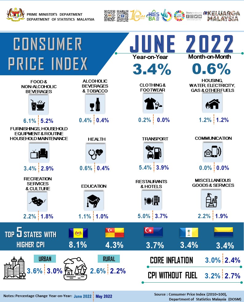 The full publication of the Consumer Price Index Malaysia, June 2022 can be downloaded from eStatistik portal.
