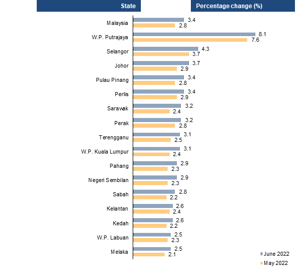 In June 2022, all states registered increases in inflation while two states showed increases above the national inflation level of 3.4 per cent. The highest increase was recorded by Wilayah Persekutuan Putrajaya (8.1%). Meanwhile, Wilayah Persekutuan Labuan and Melaka were the two states with the lowest increase by 2.5 per cent respectively.