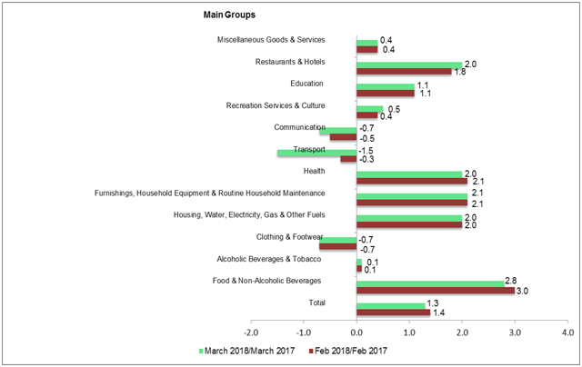 The CPI increased by 1.3 per cent in March 2018 to 120.9 compared to 119.4 in corresponding month of the preceding year. Among the major groups which recorded increases were the indices for Food & Non-Alcoholic Beverages (+2.8 per cent), Furnishings, Household Equipment & Routine Household Maintenance (+2.1 per cent), Health (+2.0 per cent), Housing, Water, Electricity, Gas & Other Fuels (+2.0 per cent), Restaurants and Hotels (+2.0 per cent) and Education (+1.1 per cent). (Chart 1)