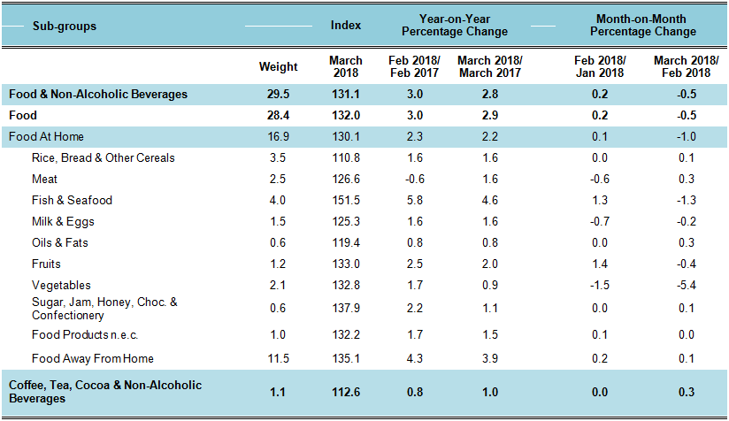 Table 1: Consumer Price Index (2010=100): Annual Percentage Change by Sub-Groups Food & Non-Alcoholic Beverages, Malaysia, March 2018/March 2017