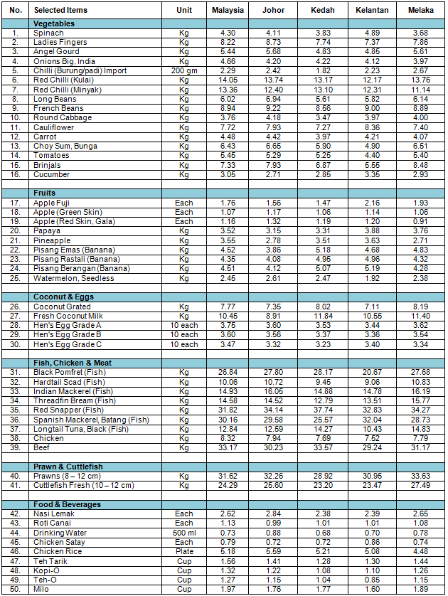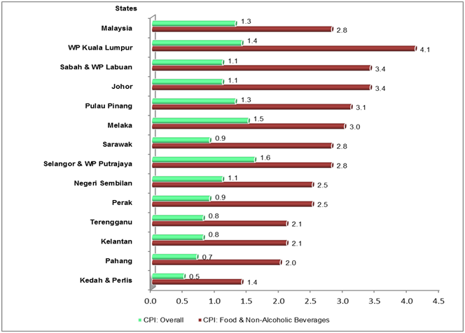 In terms of overall CPI, three states surpassed the national CPI rate of 1.3 per cent recorded in March 2018 as compared to March 2017. The states are Selangor & Wilayah Persekutuan Putrajaya (+1.6 per cent), Melaka (+1.5 per cent) and Wilayah Persekutuan Kuala Lumpur (+1.4 per cent).