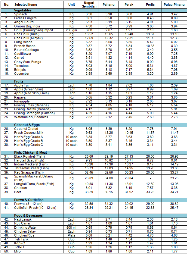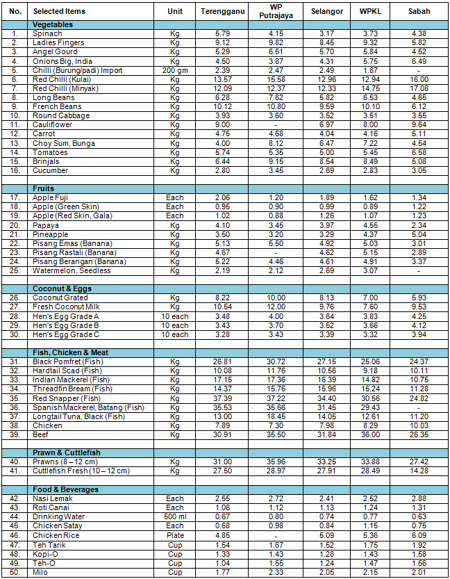 The overall index for Food & Non-Alcoholic Beverages which accounted 29.5 per cent in the CPI weights, increased 2.8 per cent in March 2018. The increase was driven by food sub-group index which comprised of Fish & Seafood (+4.6 per cent), Fruits (+2.0 per cent), Milk & Eggs (+1.6 per cent), Sugar, Jam, Honey, Chocolate & Confectionery (+1.1 per cent) and Vegetables (+0.9 per cent). Slowing in pace of 0.9 per cent for the sub-group Vegetable index in March 2018 (February 2018: 1.7 per cent) was due to the index of goods which showed a drop in most states such as Long Beans (-8.3 per cent), Round Cabbage (-7.5 per cent) and French Beans (-7.5 per cent). Meanwhile, the index for Food Away From Home increased 3.9 per cent in March 2018.