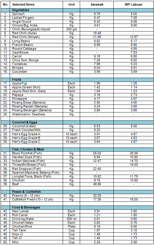 Average Price for Selected Items in Malaysia, March 2018 (RM)