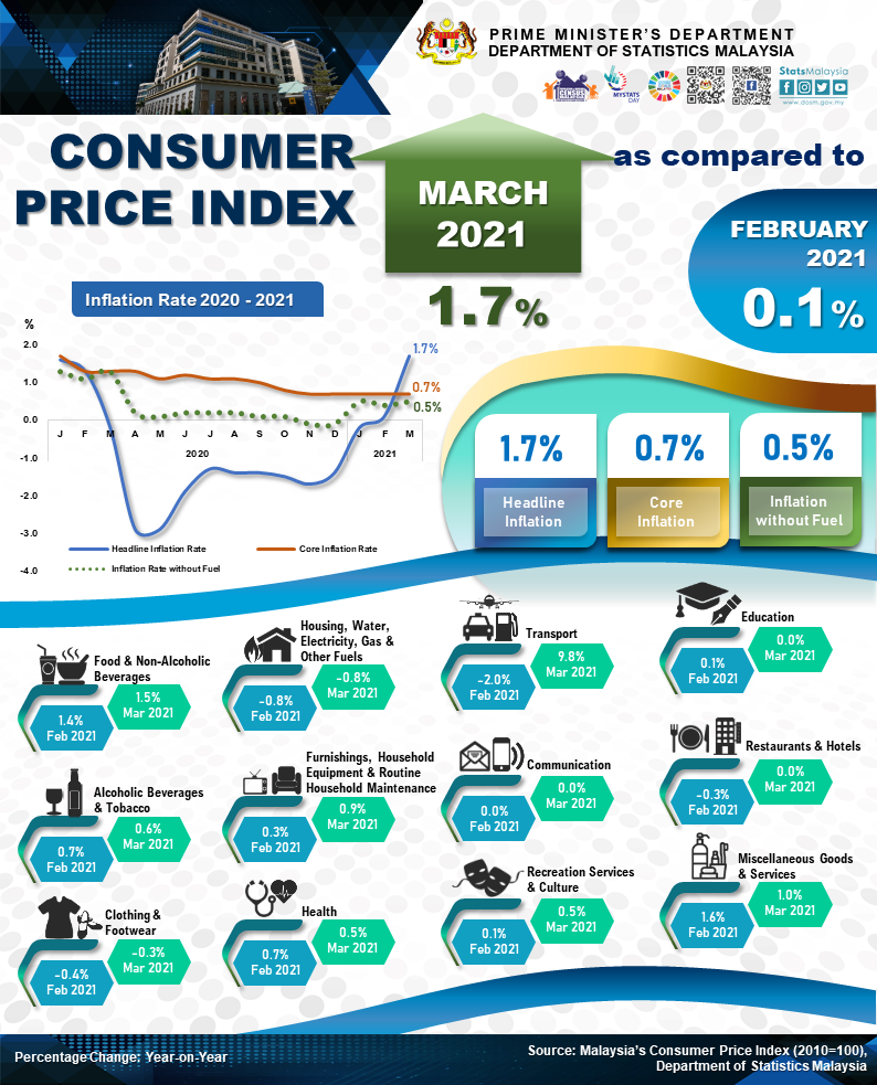 The full publication of the Consumer Price Index Malaysia, March 2021 can be downloaded from eStatistik portal.