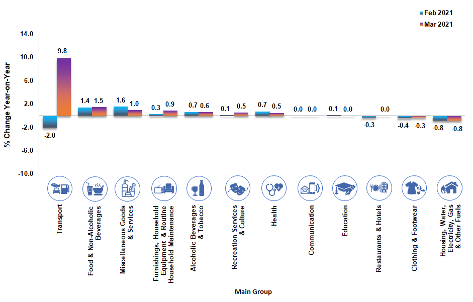 Core index rose 0.7 per cent in March 2021 as compared to the same month of the previous year. Among the major groups which influenced the increase were Food & Non-Alcoholic Beverages (1.1%); Miscellaneous Goods & Services (1.0 %); Furnishings, Household Equipment & Routine Household Maintenance (0.9%); Transport (0.6%); Health (0.5%) and Recreation Services & Culture (0.5%).