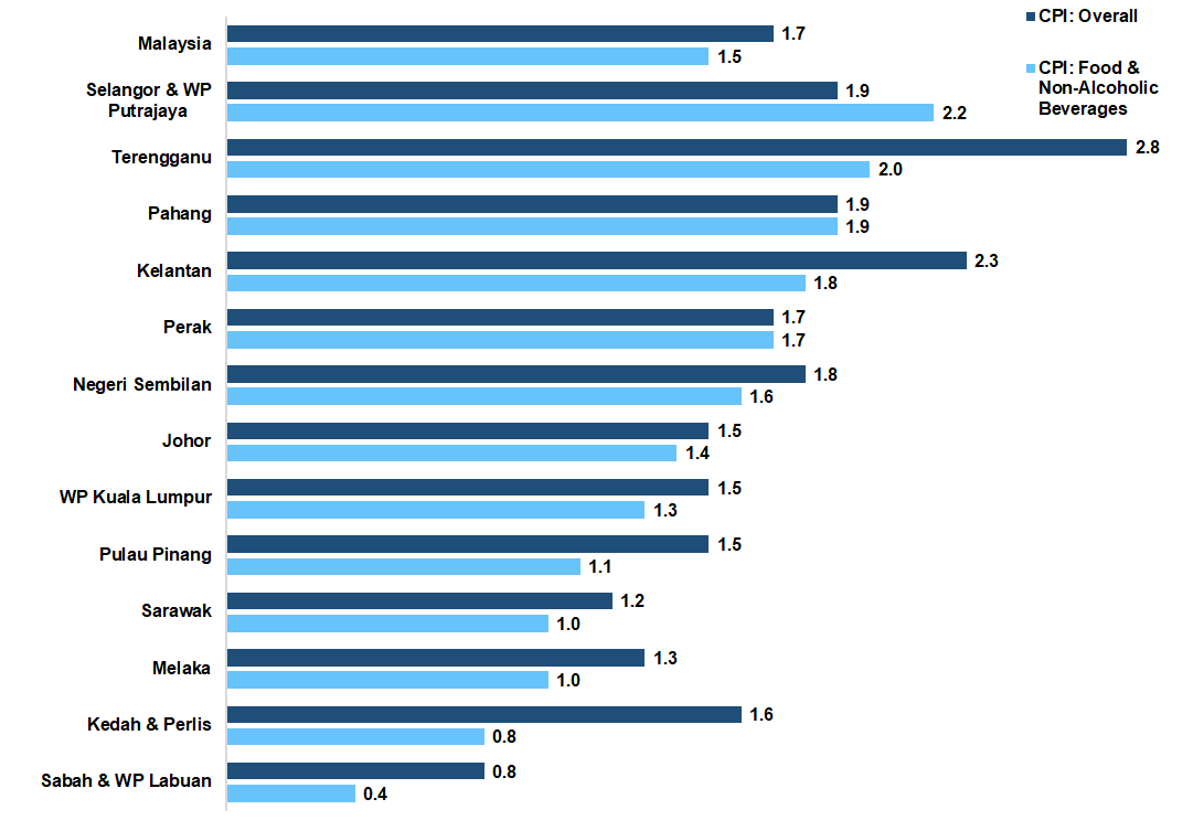 Five states namely Terengganu (2.8%), Kelantan (2.3%), Selangor & Wilayah Persekutuan Putrajaya (1.9%), Pahang (1.9%) and Negeri Sembilan (1.8%) surpassed the national CPI rate of 1.7 per cent in March 2021 as compared to the same month of the previous year.