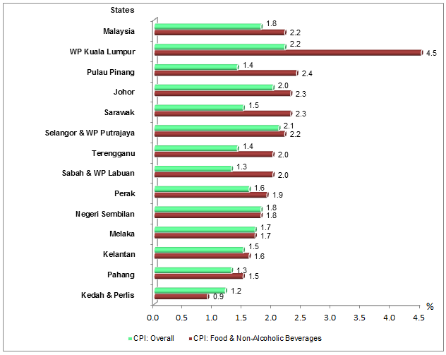 In terms of overall CPI, three states surpassed the national CPI rate of 1.8 per cent recorded in May 2018 as compared to May 2017. The states were Wilayah Persekutuan Kuala Lumpur (+2.2 per cent), Selangor & Wilayah Persekutuan Putrajaya (+2.1 per cent) and Johor (+2.0 per cent).