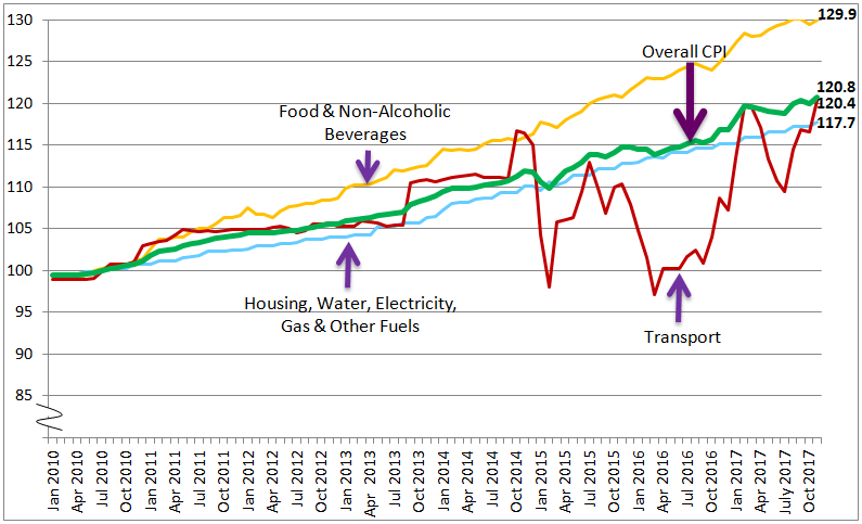 The overall index for CPI rose by 3.4 per cent to 120.8 in November 2017 from 116.8 in the corresponding month of the preceding year. Among the major groups which recorded increases were the indices for Transport (+10.8 per cent), Food & Non-Alcoholic Beverages (+4.0 per cent), Restaurants and Hotels (+2.8 per cent), Furnishings, Household Equipment & Routine Household Maintenance (+2.5 per cent), Health (+2.2 per cent) and Housing, Water, Electricity, Gas & Other Fuels (+2.2 per cent). (Table 1)