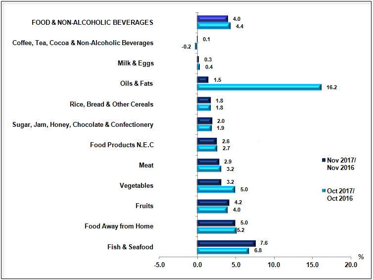 CPI for the period January to November 2017 registered an increase of 3.9 per cent compared with the same period last year. The index for Food & Non-Alcoholic Beverages was the main contributor to the rise in CPI for the period January to November 2017, registering an increase of 4.3 per cent. The increase was contributed by the index for Food Away From Home (+4.7 per cent) and Food At Home (+4.2 per cent). While, the index for Coffee, Tea, Cocoa & Non-Alcoholic Beverages decreased 0.3 per cent. Among the subgroups of Food At Home which showed significant increases during this period as shown in Table 2 were Oils & Fats (+33.0 per cent), Fish & Seafood (+6.7 per cent), Vegetables (+4.1 per cent), Fruits (+3.4 per cent) and Meat (+3.0 per cent).
