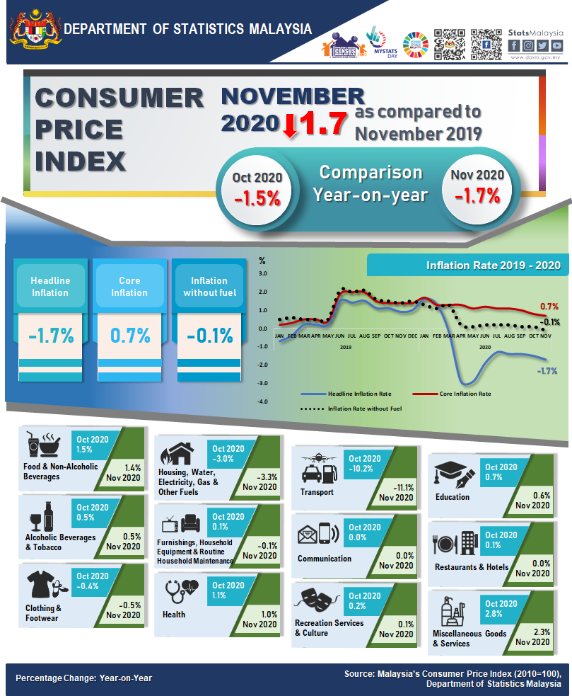 Meanwhile, CPI for the period of January to November 2020 decreased 1.1 per cent as compared to the same period last year. The decrease was attributed by Transport (-10.1%), Housing, Water, Electricity, Gas & Other Fuels (-1.7%) and Clothing & Footwear (-1.0%).