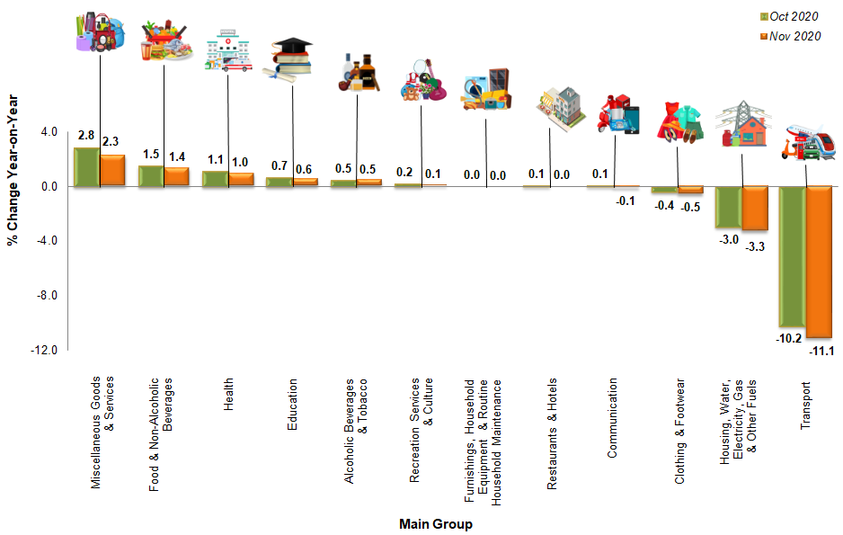 Core index rose 0.7 per cent in November 2020 as compared to the same month of the previous year. Among the major groups which influenced the increase were Miscellaneous Goods & Services (2.3%), Food & Non-Alcoholic Beverages (1.2%), Health (1.0%), Housing, Water, Electricity, Gas & Other Fuels (0.6%) and Education (0.6%).