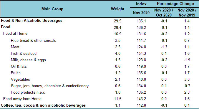 The index for Food & Non-Alcoholic Beverages increased 1.4 per cent in November 2020 as compared to the same month of the previous year. Among the subgroup that showed an increase include Vegetables (3.0%), Food products not elsewhere classified (2.3%), Fruits (1.7%), Oil & fats (1.7%), Fish & seafood (1.6%), Meat (1.1%) and Rice bread & other cereals (0.7%).
