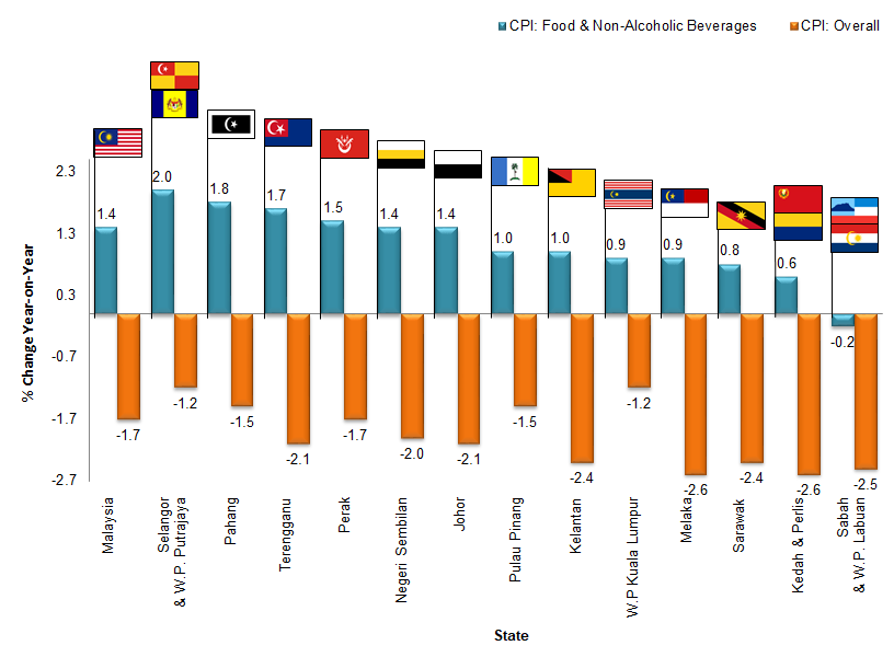 However, all states registered an increase in the index of Food & Non-Alcoholic Beverages. The highest increase was recorded by Selangor & Wilayah Persekutuan Putrajaya (2.0%). This was followed by Terengganu (1.8%), Johor (1.7%) and Kelantan (1.5%).