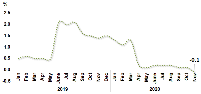 Consumer Price Index (CPI) declined 1.7 per cent in November 2020 to 120.0 as against 122.1 in the same month of the preceding year. The decrease in the overall index was attributed by the decline in Transport (-11.1%), Housing, Water, Electricity, Gas & Other Fuels (-3.3%), Clothing & Footwear (-0.5%) and Furnishings, Household Equipment & Routine Household Maintenance (-0.1%) which contributed 45.7 per cent to overall weight.