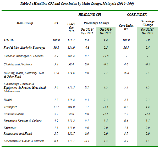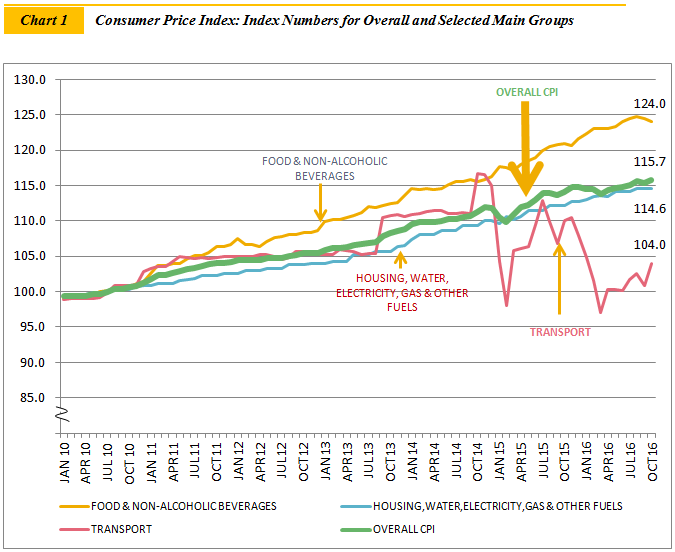 The overall index for CPI in October 2016 rose 1.4 per cent to 115.7 from 114.1 in the corresponding month of the preceding year. The increase in the indices for Food & Non-Alcoholic Beverages (+2.5 per cent ) and Housing, Water, Electricity, Gas & Other Fuels (+2.1 per cent) were offset by the decrease in the indices of Transport group by 5.5 per cent; Communication (-2.6 per cent) and Clothing & Footwear (-0.5 per cent) (Table 1).