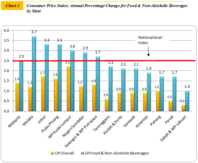The index for Food & Non-Alcoholic Beverages recorded an increase higher than the rate of overall CPI. The increase in the index for Food & Non-Alcoholic Beverages was reflected in each state in Malaysia especially those in highly urbanised states such as Wilayah Persekutuan Kuala Lumpur, Selangor & Wilayah Persekutuan Putrajaya, Pulau Pinang, Johor and also Melaka.