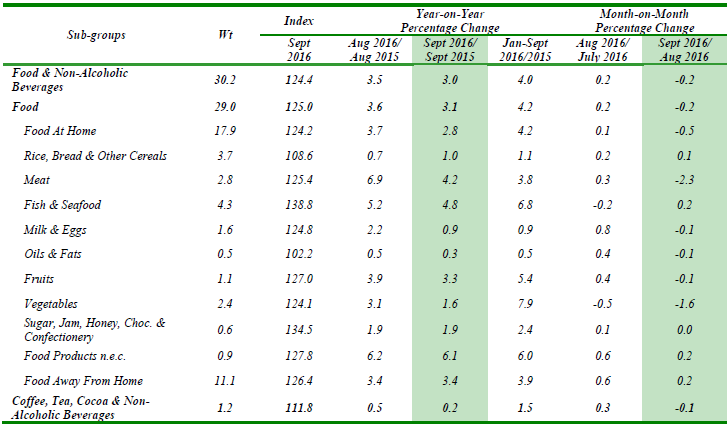 The index for Food & Non-Alcoholic Beverages increased 3.0 per cent in the September 2016. The increase was led by increases in food sub-groups namely, Fish & Seafood (+4.8 per cent); Meat (+4.2 per cent) and Fruits (+3.3 per cent). Meanwhile, the index for Food Away From Home continued to rise in September 2016, increased by 3.4 per cent.
