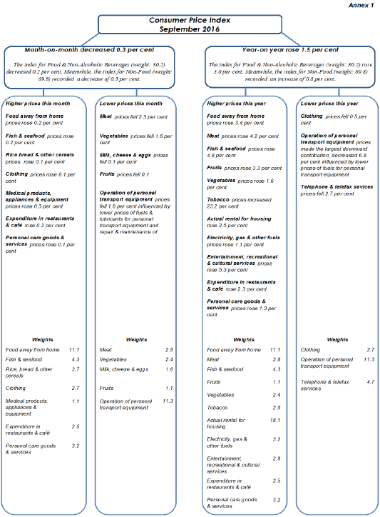 CPI increased at the same pace of 1.5 per cent in September 2016, however the index for Food & Non-Alcoholic Beverages recorded a rate of 3.0 per cent.