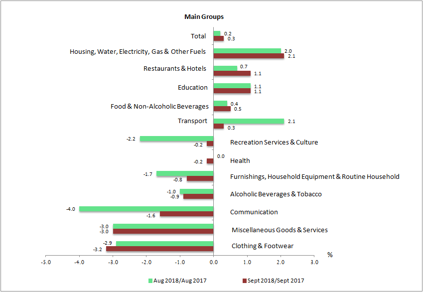 Five of the twelve main groups still record positive annual price changes namely Housing, Water, Electricity, Gas & Other Fuels (+2.1 per cent), Restaurants & Hotels and Education (+1.1 per cent) respectively, Food & Non-Alcoholic Beverages (+0.5 per cent) and Transport (+0.3 per cent). (Chart 1).